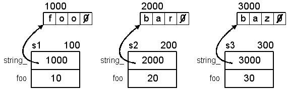 would produce something like this in memory:String s1("foo"); String s2("bar"); String s3("baz"); s1.foo = 10; s2.foo = 20; s3.foo = 30;