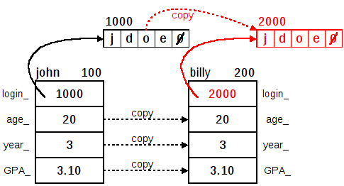 Output:void f6() { Student john("john", 20, 3, 3.10f); Student billy("billy", 21, 2, 3.05f); billy = john; // Assignment }