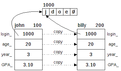 Student john("john", 20, 3, 3.10f); // Copy constructor Student billy(john);