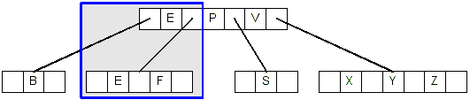 - Deleting E is case #2.2: E is in an internal node and its right childe
